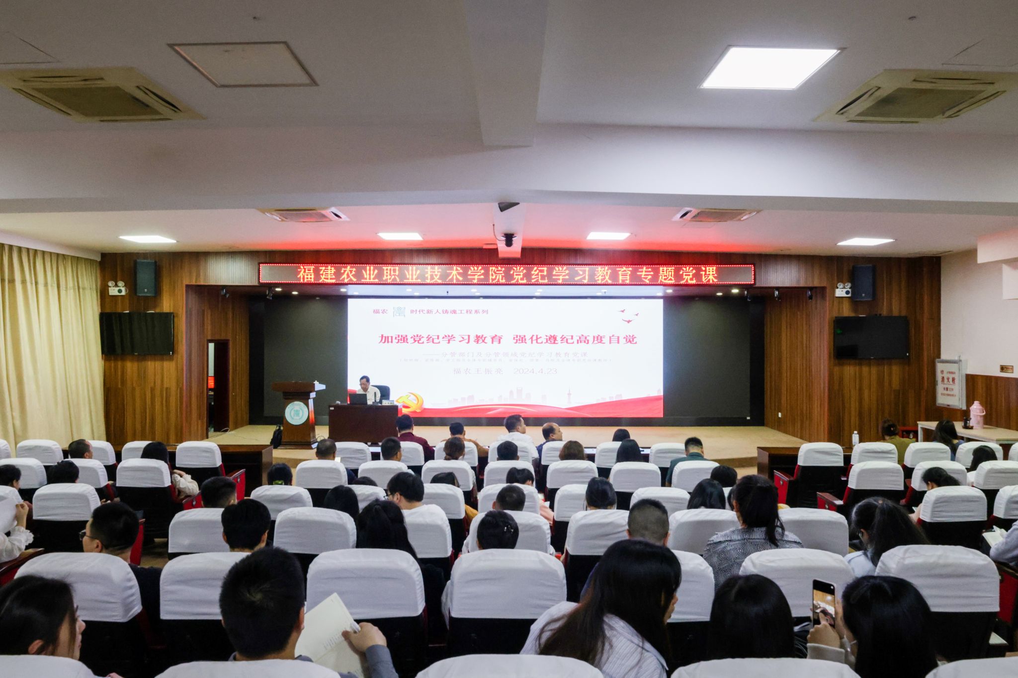 4月23日下午,学院党委副书记王振亮以《加强党纪学习教育 强化遵纪高度自觉》为题,为分管部门和分管领域干部职工讲授专题党课。